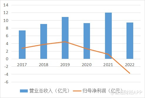 2017年至2022年间,公司营收分别为7.432亿元、9.056亿元、10.92亿元、9.3亿元、12.06亿元和9.451亿元,归母净利润则分别为2.735亿元、3.717亿元、4.427亿元、2.613亿元、1.174亿元和-3.764亿元。