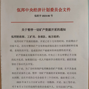 4月15日,缅甸佤邦中央经济计划委员会出台红头文件称:为了及时的保护佤邦剩余的矿产资源,在不具备成熟的开采条件之前,暂停一切矿产资源的开采和挖掘。对合同尚未到期,还在开采的公司企业给予三个月时间,做好善后工作。2023年8月1日后矿山停止一切勘探、开采、加工等作业。对于8月 1日后仍违规作业的企业或个人,交司法部门严惩。