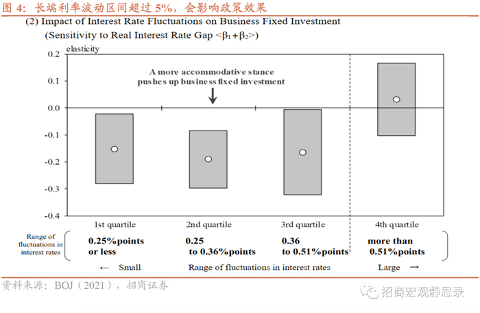 对此,我们更倾向于场景三,日本央行有转向重视中端国债收益率控制的可能性,同时或因金融风险政策权重和外溢性压力而采取渐进措施。我们亦保持对其他激进调整的风险场景的重视,但是根据日本央行对于2016-2020年收益率曲线控制政策的评估,应注意到:针对场景一的扩大长债浮动区间,日央行评估认为长端利率浮动区间超过目前±50BP后,对固定投资的政策效果反而减退。针对场景二的激进退出方式,这需要在10年国债收益率稳定在较低水平的时期进行,否则会对美国国债、特别是美国信用市场,澳大利亚、英、法等其他发达经济体国债市场形成显著的外溢性冲击,同时部分新兴经济体有资本流出风险,日本央行需要面对较大的外部压力。而我们所进行的反事实分析表明,日央行截至23年2月的净购债仍将10年国债利率压低了40BP左右,扩大浮动区间至75BP以上或者完全放开的话,10年日债收益率存在明显的上行风险冲击。在2016年9月,日本央行推出了固定短端利率在-0.1%和控制国债长端利率浮动范围在0±0.1%的政策框架,固定价格而以数量(无限量购债)出清。一般而言,经典的货币政策影响短端、传导至长端利率后,通过长端利率来影响总需求,作用于私人部门的消费、投资、雇佣或裁员等等,进而影响产出缺口和通胀,日本央行的收益率曲线控制即是直接对长端利率进行校准。另外,一般货币政策在短端到长端利率的传导过程中,前瞻性指标是强化有效性的重要一环,而日央行控制收益率曲线的承诺,如果市场认为可信,则可以较低成本去实现政策目标。但是,日本央行认为在日本经济体长年陷入资产负债表衰退的背景下,其低利率对产出缺口的传导渠道更多是通过汇率和股市,而非融资成本的降低,因此综合评估2016-2020年来看:首先,相比长端利率,反而是中短端利率对于产出缺口和通胀的影响更为明显,应强调日央行转向重视5年国债收益率的可能性并不低。同时,此方案需要日央行提前进行较明确的前瞻性指引,以避免后市过度波动。其次,如果超长端的20年国债收益率过低,实证显示对于消费者信心会有显著负面影响。最后,对于固定投资而言,其与长端的10年国债收益率相关性更高,但是长端利率的浮动区间超过±0.5%之后,政策效果反而边际减退。如果10年国债收益率仍有上行波动风险,那么扩大浮动区间、或者事实上允许退出收益率曲线控制政策退出的措施,不仅会对其他发达经济体形成外溢性冲击,亦会对日本已长期低迷的私人部门固定投资造成负面影响。
