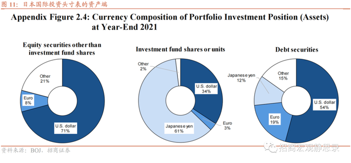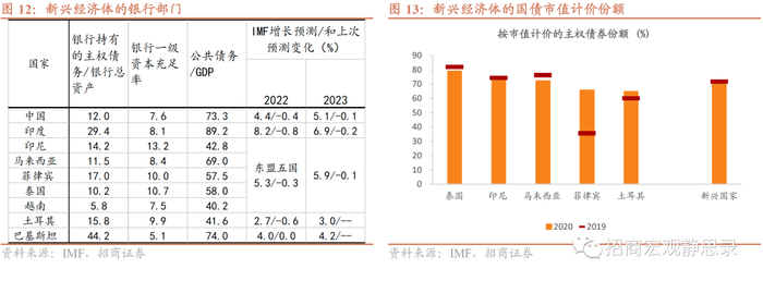 日本央行的QQE曾显著压低其10年国债收益率,长年以来套息交易和日资海外配置亦拉低了美债和其他国债收益率,即使未来出现渐进式的政策变化,预计也会对美国和其他经济体形成显著的外溢性。首先,随着欧央行等退出负利率和日央行22年底调整,全球负利率债券规模从20年峰值的18.4万亿美元自23年初已降至0附近,若日央行调整会进一步或将进一步打击负利率受益资产。从零息通胀保值债券的角度来看黄金,其与实际利率的相关性在实际利率为零附近较高,且与全球负利率债券规模呈正相关关系。如果日央行进行框架调整,会进一步令黄金价格与实际利率的关系脱敏。其次,如果日本央行改变收益率曲线控制框架,或推动日本存量资金回流和加速国际资本增量流入日本金融市场,这会对美国国债和信用市场形成一定的收益率上行压力、澳大利亚英法等发达经济体的国债收益率亦有明显影响,同时部分新兴经济体有资本流出的风险,存在显著的溢出效应。日本超长期的货币宽松形成了其特殊的国际投资头寸表结构。截至2021年底,日本净资产头寸达到411.2万亿日元的历史新高,资产端的债券项下美元占比54%,欧元19%;股票项下美元占比71%,欧元8%。1)对美国信用市场有一定冲击,因为日资所持美国企业债规模在3500亿美元左右,美国USD IG市场总规模接近8万亿美元,占比约4.4%。2)部分发达经济体的国债收益率会受到影响,因为日资所持澳大利亚国债占比约12%,荷兰约11%,法国约7%,爱尔兰超过15%,英国、美国和比利时约5%上下,特别是欧元区较脆弱性、易被金融市场集中做空的意大利和西班牙约4%。3)新兴经济体方面,日资在墨西哥和印尼国债市场占比亦在2%以上。在本轮美联储加息周期,新兴经济体抵御典型的国际收支冲击的能力整体上有所增强,但是印尼存在市值法计价国债份额较高、银行部门持有国债占总资产比例较高的问题(图12)。如果日本央行最终决定进行调整国债收益率曲线控制框架,渐进式的调整方式会引致市场一致预期、加大政策成本;但是较激进的调整措施会显著加大对其他经济体的外溢性。两相权衡之下,我们倾向于将外压所致的渐进式调整作为基准情形。日本险资和银行所主导的资金回流在2022年累计已超过2000亿美元,预计在政策调整预期下该趋势将会持续,叠加美元指数回落背景,日元或进一步升值、同时流动性重新分配对日本股市形成利好,特别是长期超低利率环境下利润承压的银行部门,但对此前日资持有的境外资产则将呈现利空冲击。
