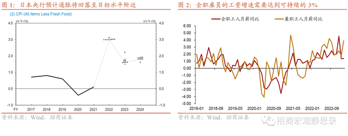 2)通胀和劳动力市场方面,尽管日本23年2月CPI达到3.3%(前值4.3%),目前的关键并不在于具体读数,而是在于通胀是否通过产出缺口改善而生产的,亦即在供给侧和能源食品等成本价格冲击消退之后,通胀是否仍能够保持在2%。日本央行认为这要求名义工资具备3%的增速,实际工资增速能保持1%。应注意到,2016年9月日本央行推出的新政策框架包含了通胀超调承诺,即在经济周期内平均2%为通胀目标,以应对长期通缩环境所形成的通胀预期