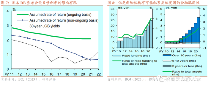 其二,从非银部门来看,根据日本央行(Financial System and Bank Examination Department, 2023)的评估,日本的人寿保险机构有可能出现和英国负债驱动型LDI养老金类似的流动性问题,需要密切关注寿险机构潜在的系统性影响。2022年三季度,英国特拉斯政府财政政策引起英国国债长端利率大幅上行,英国养老金陷入高杠杆所致的保证金追加和流动性紧缩冲击,进一步导致国债市场动荡和英央行介入干预。传导机制中的一个根本原因是,英国DB企业养老金系统在2004-05年引入了负债端的市值法估值体系(the Pension Act 2004, the Financial Reporting Standard 17),2008年后的长期利率下行环境导致负债端市值上升,致使英国DB养老金采用LDI策略以匹配资产端,在加杠杆的同时采用利率互换IRS做空利率以增加收益。对比来看,日本央行认为虽然在长期的通缩环境中,日本养老金机构对国债利率风险考虑较为充分,但是寿险机构在会计制度和收益率寻求等方面的风险激励机制与英国养老金类似,有可能导致未来出现类似的流动性冲击。1)日本寿险机构正在落实市值法估值的监管制度,而且据评估,日本险资机构已经在新规压力下采取了和英国DB养老金类似的策略,即为了削减资产和负债端的久期错配,而转向长期债券、增加杠杆和利率互换的使用。压测表明,如果日债收益率上下浮动50个BP,其负债端变化无法覆盖资产端变化的部分——以ESR指标(净资产/风险金额,考虑到利率风险等压力)表示——会分别变动11%和19%。2)日本企业养老金的风险的此类风险较小。其加杠杆以寻求收益的风险激励较小,主因其会计制度限制了利率变化的传导。具体而言,日本养老金在持续运营假设下所使用的负债端贴现率是长期预期投资收益率,在非持续运营(即养老金面临终止)假设下所使用的贴现率为过去五年移动平均的市场利率。日本养老金的流动性(现金和存款)比例较高,债券持有比例在40%左右(相对于英国的70%左右)。