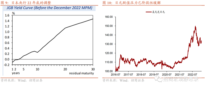 疫情冲击之后,发达经济体的通胀中枢上移,欧央行于22年7月退出了负利率时代。22年12月,BOJ超预期上调10年国债波动区间至±50BP。2022年一季度起,随着美联储启动加息周期,日本和欧美货币政策不同步,日元逐渐形成贬值一致预期,美元兑日元在10月贬值至146附近,输入型通胀压力增加、当月CPI同比达到3.7%。日本国债收益率曲线出现扭曲,市场一致预期下,年中曾出现过日本10年国债期货受国际投资者冲击而触发熔断机制。加之日本央行行长黑田任期将至、23年春季工资谈判预期较强,日本央行YCC所形成的扭曲难以持续,12月BOJ超预期扩大国债波动区间,新任行长植田亦在计划评估过去几十年的货币政策,或为转向铺路。若BOJ结束负利率与YCC,很可能将对全球资产形成较大的外溢性冲击。