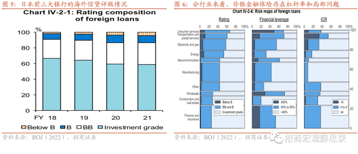 其一,从银行部门来看,1)由于日本的大型银行积极扩展海外业务,其海外信贷在疫情冲击后出现了逐步的资质下沉和结构性高杠杆,特别是海外信贷投向之中的非银金融和保险行业,有传导欧美银行业冲击和利率波动的潜在风险。日本三大主要银行的非投资级别贷款(BB级别及以下)占比在疫情后从30%的水平升至40%(图5,Financial System Report 2022),整体水平并不高,但是存在局部的结构性脆弱环节。分行业来看,根据三大行的海外信贷风险指标(图6),风险点集中在非银金融和保险行业,即使较安全的投资级别贷款也存在高杠杆问题,杠杆率(有息债务/总资产)指标反映该部门未偿还海外信贷中接近20%的部分杠杆率超过60%,超过30%的部分杠杆率在40%-60%。这是近年来日本大型银行重点业务方向所致使的,疫情冲击后,日本三大行对海外非银金融和保险行业的贷款增速在2021和22年均达到40%-50%的水平。具体来看,在大型基金方面,未偿还贷款中非投资级别占比已接近50%(相比部门整体的非投资级别占比在30%以下)。尽管美联储本轮加息预计已近尾声,但美债10年期收益率已先行反映了经济下行和23年转向降息等预期,后市有可能出现波动,高杠杆和非投资级别比例等特征均指向此类资产会对利率波动更为敏感。而在保险资金方面,亦有受到欧美金融行业风险传导的潜在风险。由于疫情后居家办公趋势和商业办公楼空置率的居高不下,叠加利率上行,美国保险机构的资产端约有5700亿美元商业地产抵押贷款和1990亿美元的CMBS,考虑到金融危机后的常年整固下其具有固定利率和长期限特征,在较小比例违约损失的假设下(例如5%),保险机构损失的量级在几百亿美元的水平、整体可控,但应注意有可能引发一致性悲观预期和资金外流。2)除大型银行的海外信用风险之外,区域性银行和信金银行(Shinkin Bank)资产端的日债利率风险为近十年来最高位,主因区域性银行和信金银行近年来持续增加了其债券投资组合的久期。