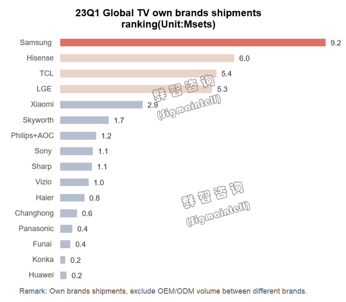 其他海外品牌如飞利浦(Philips)、Vizio以及夏普(Sharp)等日系品牌,在欧美以及亚太市场受到海信及TCL的激进策略冲击,出货规模及全球市占均呈现同比大幅衰退的趋势。