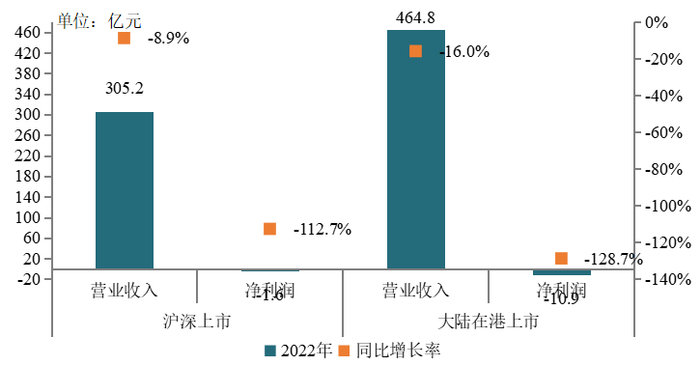 2022年,沪深及大陆在港上市房地产公司营收增速由正转负,净利润大幅下降,部分房企出现亏损。其中,沪深、大陆在港上市房地产公司营业收入均值分别为305.2亿元、464.8亿元,同比分别下降8.9%、16.0%,增速较上年下降18.1、30.4个百分点,净利润均值分别为-1.6亿元、-10.9亿元,同比分别下降112.7%、128.7%,降幅较上年扩大51.4、85.4个百分点。沪深上市公司中约有31.5%出现亏损,大陆在港上市公司中约有51.7%出现亏损,其中,14家上市房企亏损超百亿,21家上市房企连续两年亏损。