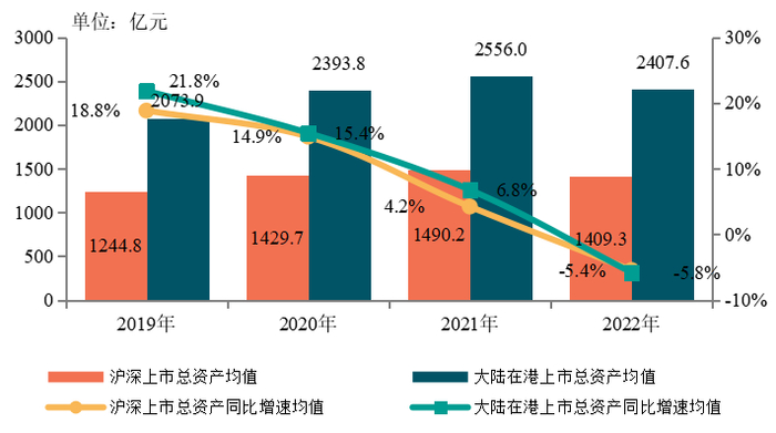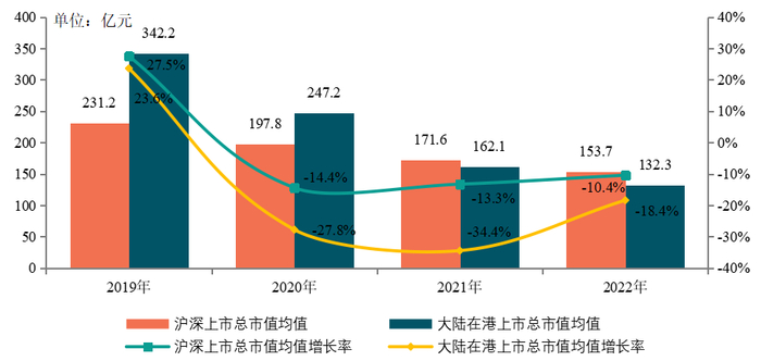 2019-2022年沪深及大陆在港上市房地产公司市值均值及其增长率