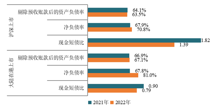 2022年,沪深上市公司剔除预收账款后的资产负债率略有下降,而大陆在港上市公司则略有上升。2022年,受市场调整期影响,多数房企财务安全性正经受考验,沪深上市房地产公司净负债率均值为70.8%,同比上升2.9个百分点;大陆在港上市房地产公司净负债率均值分别为81.0%,同比上升13.2个百分点。短期偿债能力持续下降,沪深上市房地产公司的现金短债比均值为1.39,大陆在港上市房地产公司现金短债比均值为0.79。