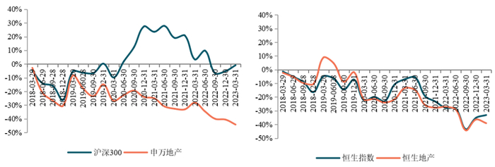 2022年,房地产板块持续走低,沪深及大陆在港房地产上市公司表现整体不如大盘。2022年A股整体在下行中呈现“W”形走势,波动幅度明显加大。2022年上半年上海等地疫情对实体经济活动造成影响,同时乌克兰危机大幅推高全球通胀,各方利空因素叠加影响使得沪深300深度下探;4月底到7月初,伴随一系列稳经济政策出台,国内充裕的流动性环境支撑沪深300持续反弹;7月中旬到10月,国内疫情多点散发扰动实体经济活动,叠加美联储连续且激进的加息节奏,沪深300再度震荡寻底;11月以后,疫情防控政策持续优化,房地产行业融资支持政策出台,沪深300迎来反弹。房地产板块走势与大盘接近,波动幅度低于大盘。2022年年末申万地产指数收盘于2964.54点,同比下降10.6%。港股市场在2022年的整体走势延续了2021年的弱势,恒生指数在震荡中持续走低,港股房地产板块整体随大盘波动,恒生地产指数年末收盘于26039.97点,同比下降12.1%。