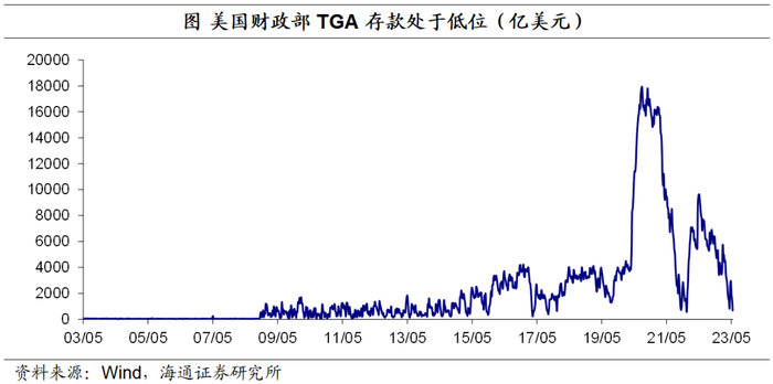 从美国债务违约风险来看,近期两党关于债务上限问题争论激烈,迟迟未达成决议,引发市场担忧,美国1年前CDS一度上升至历史高位。为避免政府违约,美国财政部已经采取了多项“非常规操作”;截至5月17日,美国财政部TGA账户存款也跌至历史低位的683.3亿美元;美国财政部耶伦也反复强调最后期限将在6月。