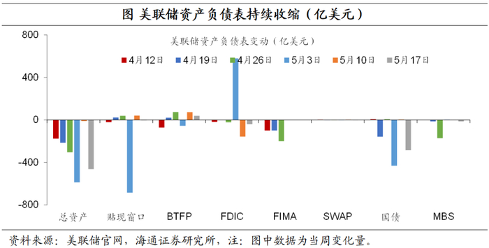 因而,我们认为,美国形成系统性金融风险的概率相对较低。例如,自3月29日开始,美联储资产负债表已经连续8周收缩;截至5月17日,美联储总资产回落至8.46万亿美元,较3月22日累计收缩了约2800亿美元。