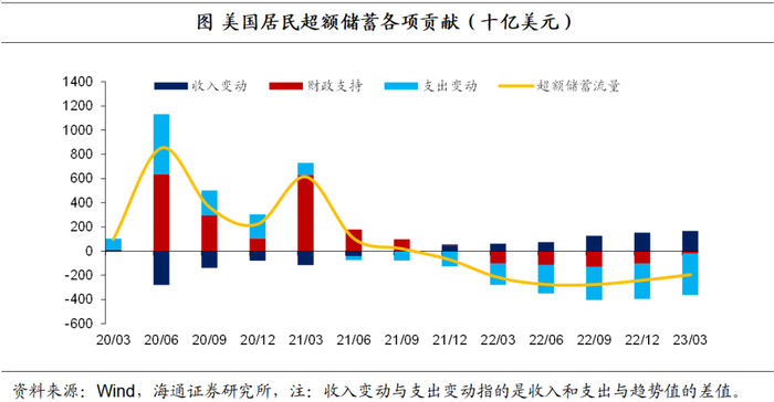 结构上来看,今年有新变化。去年开始财政退坡和强劲消费是超额储蓄的主要消耗项,而收入增长接力财政成为新贡献项。不过,今年1季度超额储蓄的消耗规模却收窄到2000亿美元以内,明显好于过去4个季度。