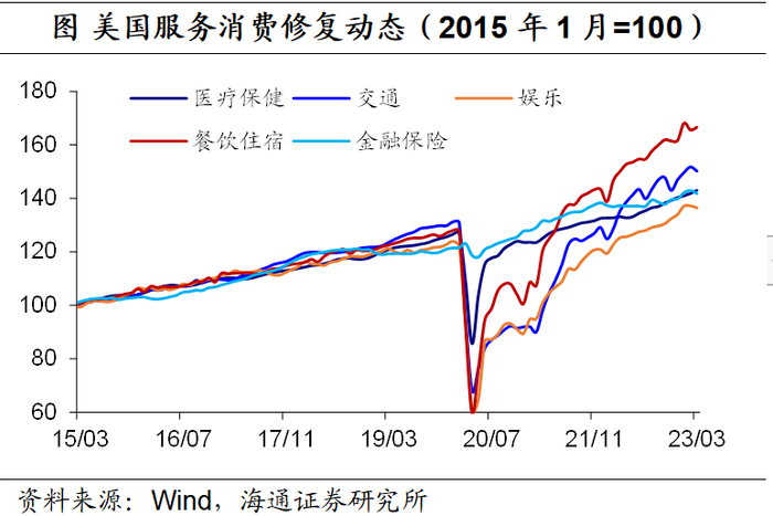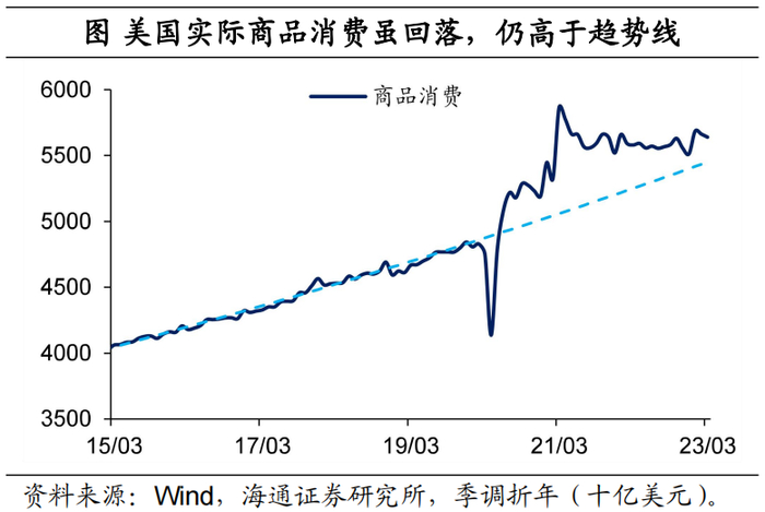 从结构来看,尽管美国商品消费在2021年3月就已见顶回落,但一直维持在趋势水平以上;剔除基数影响后,名义商品消费增速比疫情前高出约4个百分点,实际商品消费增速也好于疫情前。而服务消费增速虽然不及商品消费,但一直在稳健的修复当中,弥补了一定的商品消费放缓。