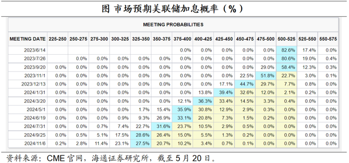 市场降息预期已有所调整。根据CME观察显示,在美国公布4月通胀数据之前,市场普遍预期美联储大概率将于9月开始降息;在就业和通胀数据陆续公布后,截至5月20日,市场预期大概率开始降息的日期已调整至11月。