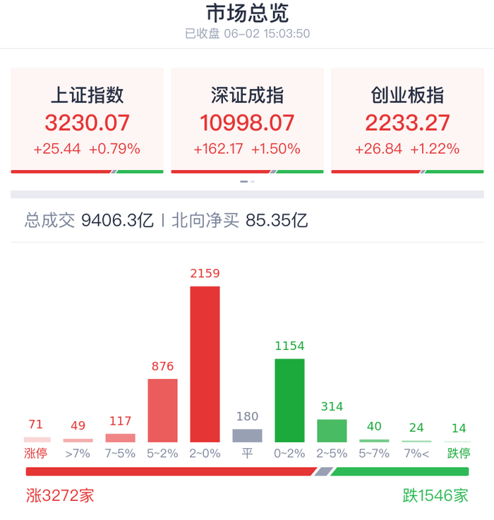 6月2日,A股三大指数高开高走,两市超3200只股飘红;截至收盘,沪指涨0.79%,深成指涨1.5%,创业板指涨1.22%。外资净买入约85亿!