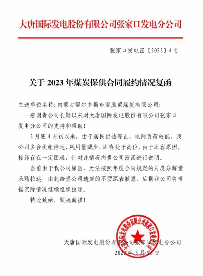 目前,甚至出现部分电厂暂时终止长协煤兑现的情况。5月25日,大唐国际发电股份有限公司张家口分公司向内蒙古鄂尔多斯潮脑梁煤炭有限公司复函称,由于公司库容原因接卸存在一定困难,无法按照煤炭年度合同规定的月度分解量采购拉运,后期公司将根据实际情况继续组织拉运。