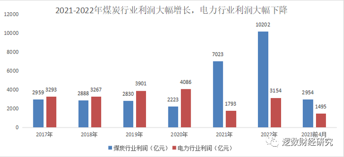 电力行业利润与煤炭行业利润恰恰相反,2021年煤炭价格大涨,电力行业利润大幅下降57.1%,2022年电力行业利润大幅增长86.3%,2023年前4月大幅增长47.2%。