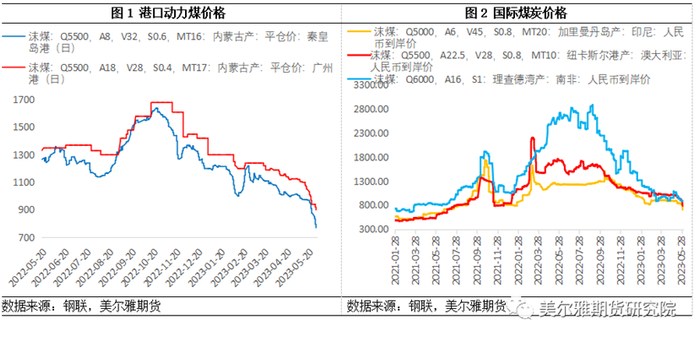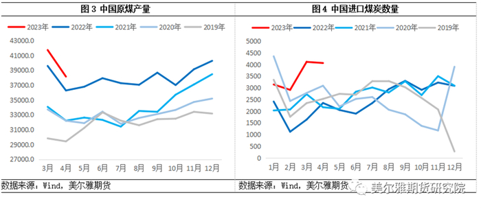 首先就动力煤而言,据国家统计局数据显示,今年1-4月,全国原煤产量15.3亿吨,同比增长4.8%,创近年同期新高。据相关机构预测,2023年我国国内煤炭产量将达48亿吨,而根据往期统计数据,市场需求侧全年饱和用量需求在42.5亿吨/年左右,仅自产煤就已大大超过需求。
