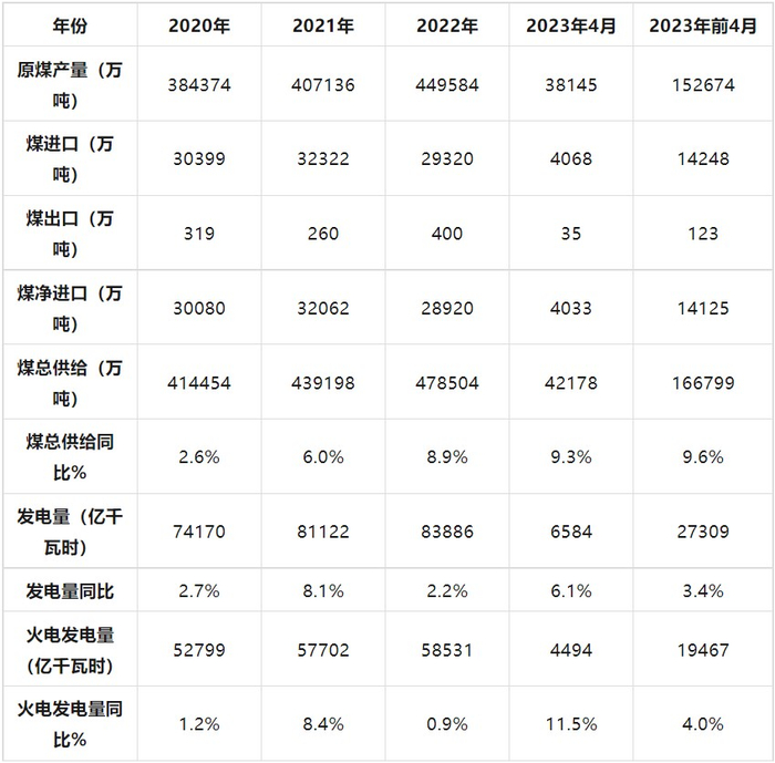2023年1-4月,煤炭总供给增长9.6%,但发电量只增长3.4%,煤炭增速显著快于发电量增速,煤炭过剩明显,火电只增长4%。