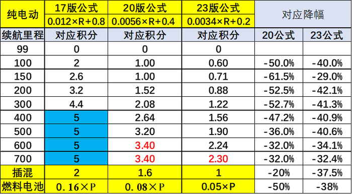 由于原来插电混动车型的双积分,得分只有两分,而纯电动车型基本都能拿到4分以上的水平,因此原有测算过程中,对高续航里程产品与低续航里程产品的差异没有充分的体现,而且对插电混动来说,相对于微型电动车得分,相对艰难。