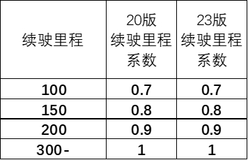 (1)当100≤R<150时,续驶里程调整系数为0.7;当150≤R<200时,续驶里程调整系数为0.8;当200≤R<300时,续驶里程调整系数为0.9;当300≤R时,续驶里程调整系数为1。