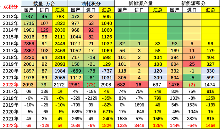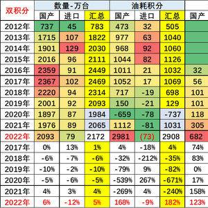 2022年新能源乘用车产量697万台,同比增长126%,其中国产车682万台,增长123%,进口新能源车16万台,增长了344%,体现了中国新能源车的强势增长。2022年国产乘用车油耗积分达到2981万分,进口车-73万分,国产车出现大幅改善,总体2908万分,2022年增长1876万分,而2021年增长1768万分,实现持续暴增。2022年国产新能源车积分达到1476万分,进口车-2万分,国产车出现大幅改善,总体1474万分,增长146%。
