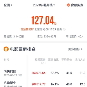 目前暑期档票房排行第一的是《消失的她》,上映39天总票房超过35亿元,大超此前市场预计的“7.5亿元到9.8亿元之间”。据猫眼专业版显示,该片上映首日预售票房为2530万,首日累计票房为1.59亿,比起2022年暑期档票房TOP《独行月球》少了将近一半。直到上映后一周到两周后,随着话题量的堆砌,票房才开始大幅度逆跌,创造了次周工作日连续五天票房逆跌的奇迹,并在距离上映首日九天的情况下,以单日3.35亿的成绩刷新了单日票房纪录。