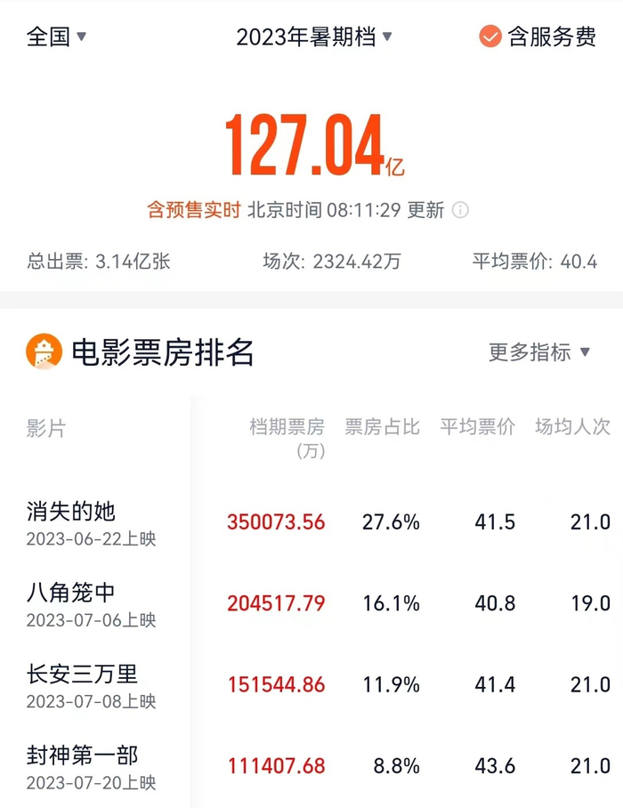 时隔四年后,暑期档票房重回“百亿”,并刷新了国内影史暑期档最快破百亿纪录。但持续火爆的暑假档电影市场丝毫没有降温之势。据灯塔专业版实时数据,截至7月31日8时,2023年暑期档(6月1日-8月31日)总票房(含预售)已突破127亿。当前暑假档档期过半,按照目前的势头,冲击177亿元的档期历史最高纪录或势在必得。