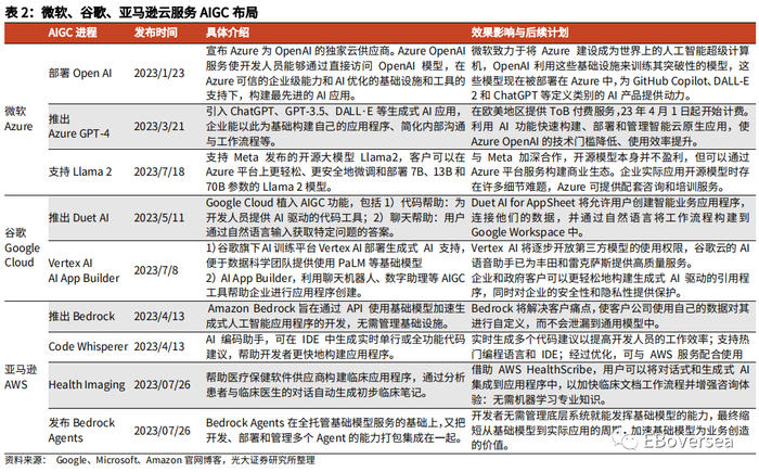 微软、谷歌通过接入自研或第三方AI大模型赋能应用程序开发,内置AIGC工具提升用户工作效率。1)微软云服务平台Azure与OpenAI、Meta等公司达成合作。23M3微软Azure中植入ChatGPT-4,并在欧美地区提供ToB付费服务。23M7微软宣布与Meta合作,引入开源模型Llama2。利用AI功能快速构建、部署和管理智能云原生应用,使Azure的技术门槛降低、使用效率提升。Azure AI的计算功能已针对大型语言模型训练进行了优化,以推动下一波AI创新所需的计算。2)谷歌云服务平台Google Cloud推出多款AI工具。Google Cloud于23M5推出DuetAI,23M7推出Vertex AI和AI App Builder,帮助用户使用PaLM等模型,并在代码、应用程序开发等方面提供帮助。