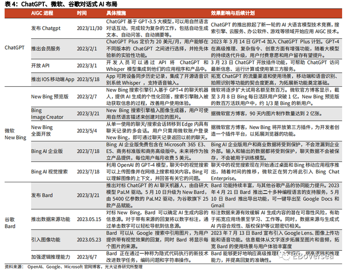 微软利用ChatGPT的模型推出New Bing,将对话式AI与搜索引擎结合。1)23M2微软推出由GPT-4驱动的New Bing测试版。根据微软官方博客,截至3月8日Bing每日活跃用户突破1亿,New Bing预览版的数百万活跃用户中,约1/3是Bing的新用户。2)推出图像生成和搜索功能。23M3微软推出的Bing Image Creator可以通过用户描述来生成图像,23M7进一步推出视觉搜索功能。3)New Bing逐渐融入微软产品生态。23M5 New Bing的聊天记录可通过微软账户进行保存。23M7推出Bing聊天企业版,将包含在Microsoft365 E3、E5、商务标准版和高级版中,未来进一步发展成为独立产品提供。