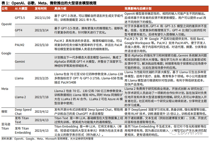 1)微软与OpenAI建立紧密的合作关系,提供平台支持服务。23M1微软宣布投资OpenAI 100亿美元,为OpenAI旗下GPT3.5、GPT4、DALL·E等AI模型提供平台接口;23M4,微软发布开源训练框架Deep Speed Chat,帮助用户以最短时间、最低成本训练自己的类ChatGPT大语言模型。