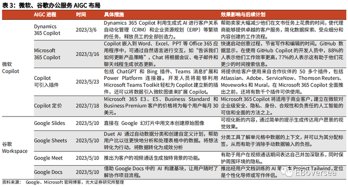 微软在办公服务领域具备先发优势,23M7 Copilot已公布较高的商业版定价。1)23M3微软发布基于Office办公软件整合AI功能的Copilot,将大语言模型的强大功能与办公软件的应用相结合,基于用户自然语言提示进行内容生成、内容修改与整合等,极大提高办公软件使用效率。2)23M5微软宣布Copilot可引入ChatGPT、Bing、Teams等拓展插件,未来将引入更多第三方插件供用户使用。3)23M7微软宣布Copilot面向Office 365 E3、E5、商业标准版、商业进阶版客户,统一定价为每个用户每月30美元。