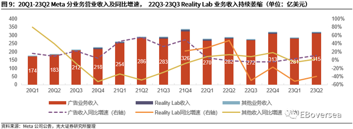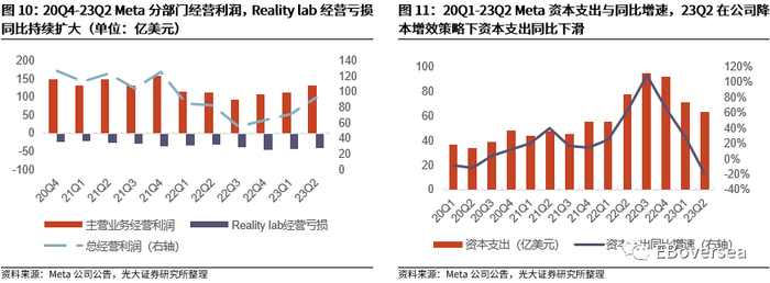 23Q2 Meta主营业务经营利润基本持稳,广告收入持续回暖。23Q2主营业务经营利润131.3亿美元,同比上升17.6%,结束连续五个季度的同比负增长。23Q2公司广告收入达315亿美元,同比上升12%,在23Q1结束连续四个季度的同比负增长后,23Q2广告收入仍持续回暖。