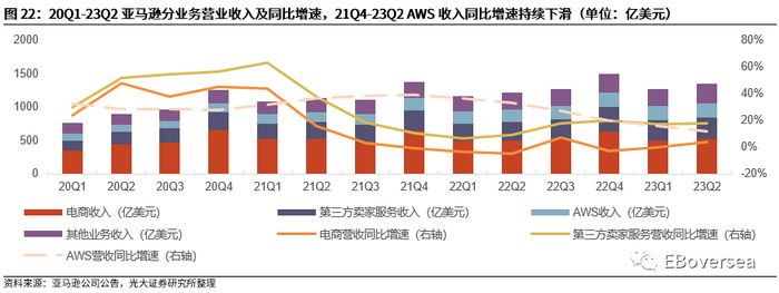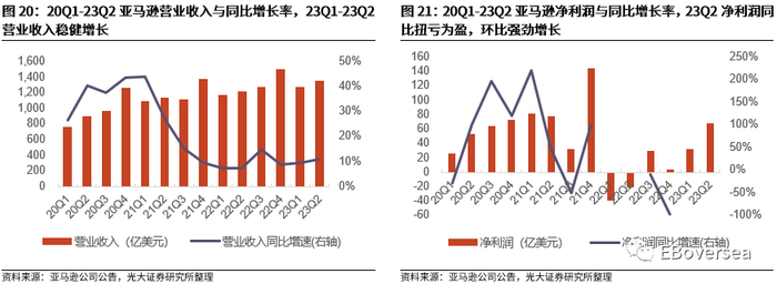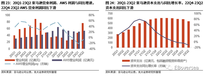 1)AWS部门收入增长放缓,营业利润同比降幅收窄。由于AWS客户以中小型科技公司为主,面对宏观经济不确定性更加谨慎,23Q2 AWS部门收入同比增长12.1%,21Q4-23Q2 AWS收入同比增速持续下滑;23Q2 AWS部门营业利润同比下降6.1%,相比23Q1同比下降21.4%,同比降幅有所收窄。2)电商收入、北美市场电商经营利润回暖。23Q2电商收入同比上升4.2%,结束连续两季度的同比下滑;23Q2北美地区营业收入同比上升11%,经营利润32.1亿美元,环比较明显回暖。