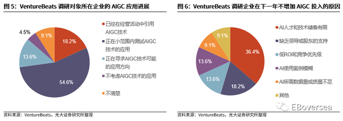 23M7调研结果显示,现阶段AIGC在企业端的应用多有企业尝试但效果不佳,相关技术人才缺失成为最大阻力。美国调研机构Venture Beats截至2023年7月25日的全球范围企业调研报告显示:1)超过70%的企业已尝试应用AIGC技术。54.6%的企业已在小范围内测试AIGC技术的应用,18.2%的企业已在经营活动中应用AIGC技术。2)仅18.2%的企业愿意在一年内增加AIGC投入。进一步拆分企业不愿增加AIGC投入的原因,36.4%的企业面临AI技术人才和相关资源缺乏的难题,18.2%的企业面临领导和股东的不支持,13.6%的企业面临低回报率的问题,13.6%的企业面临AI使用案例模糊的问题。