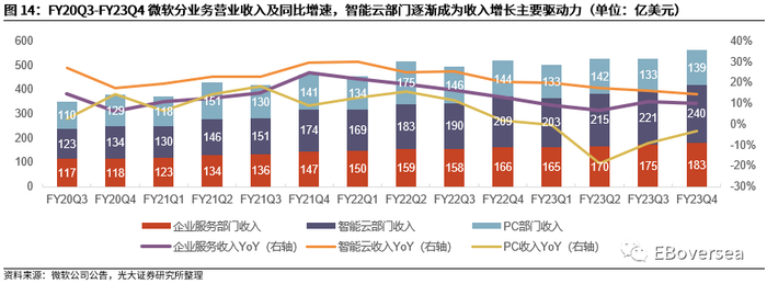 企业服务增长强劲,云服务增速放缓,个人电脑收入下滑。1)云服务增速放缓。FY23Q4智能云部门收入239.9亿美元,同比增长14.7%,相对FY23Q3同比增长16.3%有所放缓。2)企业服务、办公软件业务持续增长。FY23Q4生产力和业务流程(包含Office生产力软件、LinkedIn 和 Dynamics)的收入约为183亿美元,同比增长10%,其中Office 365商业版收入同比增长15%,Dynamics 365收入同比增长26%。3)个人电脑业务收入下滑。FY23Q4个人电脑部门收入139亿美元,同比下滑3.1%,其中搜索和新闻广告服务营收同比增长8%。