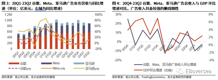 宏观经济回暖驱动广告业务复苏:随着通胀降温与就业市场维持韧性,23Q2美国GDP超预期强劲,宏观经济基本面向好,提振广告主需求,广告行业复苏成为公司业绩重要驱动力。1)23Q2谷歌、Meta广告业务营收均录得正增长。谷歌广告业务收入同比增速转正,Meta广告业务复苏强劲,同比增速重回两位数增长。2)顺周期的互联网广告行业对宏观经济动荡较为敏感。谷歌、Meta、亚马逊广告业务总收入的环比增速与美国GDP环比增速走势相近。