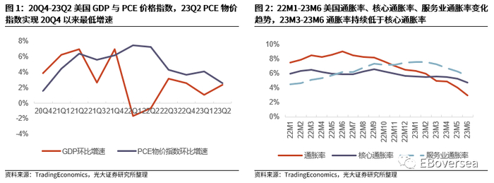 随着通胀降温与就业市场维持韧性,23Q2美国GDP超预期强劲,宏观经济软着陆概率提升。23Q2美国GDP增速2.4%(前值2%),高于市场一致预期1.8%,美国宏观经济在1994年以来幅度最大、速度最快的加息周期中展现出较强的韧性。1)23Q2美国通胀明显放缓。23M4-23M6美国CPI同比增速分别为4.9%、4%、3%,均略低于一致预期,通胀降温速度明显快于23Q1。23Q2 PCE物价指数同比增速为2.6%(前值4.1%),为20Q4以来最低增速。2)美国就业市场维持韧性。23M6美国失业率3.6%维持低位。