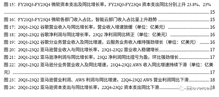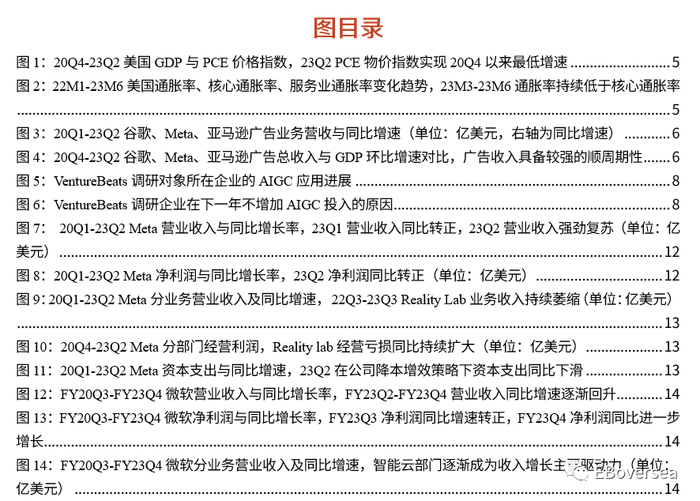 23Q2美股互联网公司业绩普遍超预期:1)Meta:净利润同比上升16.5%,时隔六个季度转正;DAU和ARPU驱动广告收入强劲复苏,Reels提供潜在广告收入增量;24年计划加大AI相关资本支出。2)微软:智能云部门收入同比增长14.7%增速放缓,24财年资本支出将逐渐增长;Copilot商业版定价,Azure收入占比提升,AIGC在业绩端的潜力尚未完全体现。3)谷歌:广告收入同比上升3.3%增速转正,云业务增长强劲,23M5谷歌I/O大会密集发布AI进展,AI与谷歌应用生态紧密结合。4)亚马逊:降本增效下资本支出持续下降, AWS的利润驱动力从优化支出逐渐转向差异化的AI功能部署。