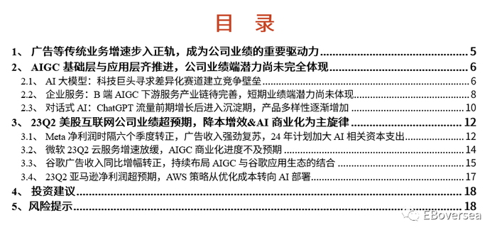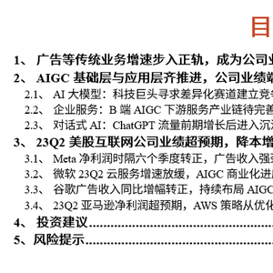风险提示:AIGC技术发展和应用落地进度不及预期、互联网公司降本增效不及预期等。