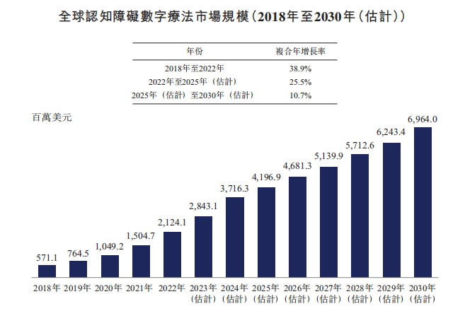 考虑到患病率增长及治疗疗法的缺位,认知障碍数字疗法市场未来增长空间十分可观。招股书显示,2022年,全球认知障碍数字疗法的市场规模达到21亿美元,预计2025年将增至42亿美元,2030年将增至70亿美元,复合年增长率分别为25.5%及10.7%。