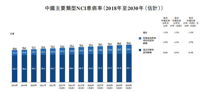 招股书显示,认知障碍的病因主要包括血管疾病、神经退行性疾病、精神疾病及儿童发育缺陷四类。2022年,全球这四种主要类型的认知障碍的患病人数为17.031亿;预计2025年人数将高达18.064亿,并在2030年进一步达到19.913亿,复合年增长率为2.0%。