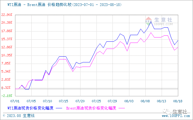 本周开始原油连续三个交易日下滑,周四收盘小幅上涨,截止17日美国WTI原油期货主力合约结算价报80.39美元/桶,布伦特原油期货主力合约结算价报84.12美元/桶。由于欧美银行业不稳定,叠加全球经济增长前景的担忧令原油承压,周初原油收盘价格连续走低。但是OPEC与俄罗斯原油供应减少以及能源需求向好对油价起到支撑作用,加之中国石油需求增长的乐观预期持续利好油价,而北半球夏季需求旺季期间,国际油价利好因素仍存,周四原油收盘价格上涨,整体来看国际油价仍处于高位水平。成品油市场与原油价格联动性比较强,近期国内成品油市场价格高位小幅回落。