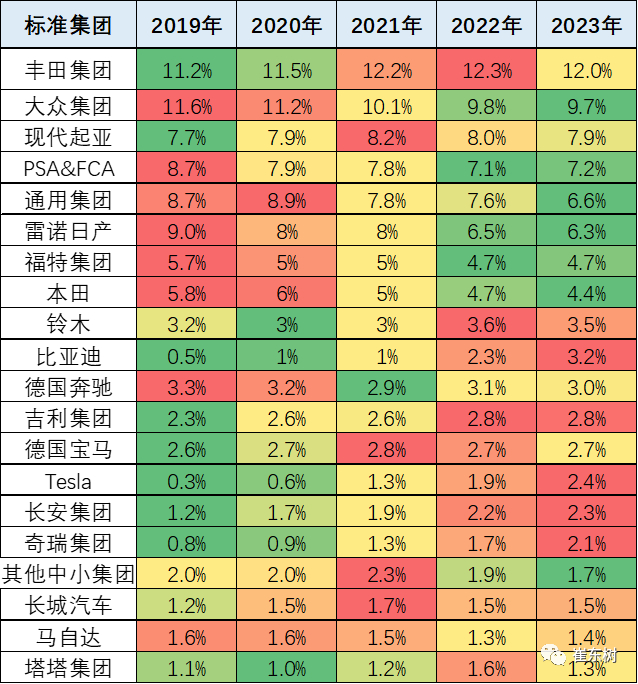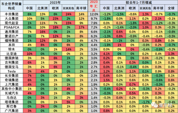 丰田集团表现相对稍弱,较去年下降0.7个百分点,2023年在世界份额已经达到12.0%左右的水平,但东南亚市场总体表现较强。