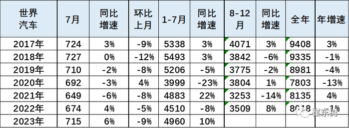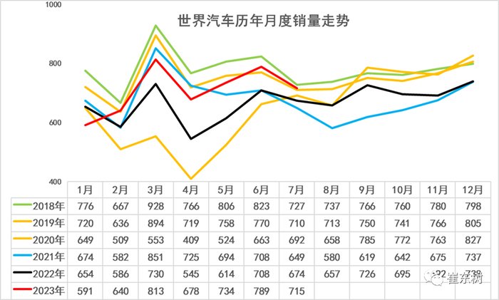 2023年7月的世界汽车销量达到715万台,同比增6%,较2018年7月仍稍低2%,处历年的次高位水平。