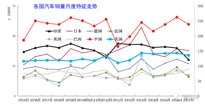 6、各国汽车销量月度走势特征
