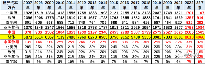 中国汽车市场对世界汽车市场影响力极其巨大。2016-2018年中国汽车占世界30%左右,2019年下降到29%,但仍具有绝对优势。2020-2021年国份额回升到32%。2022年中国份额上升到33%。2023年中国份额下降到32%,这也是中国市场春节因素和车购税优惠政策退出的正常体现。北美洲和欧洲市场份额全面回升,南半球市场走势偏弱。