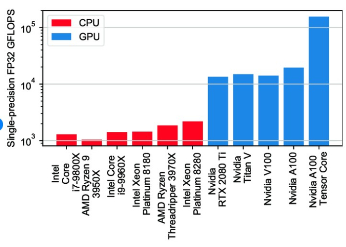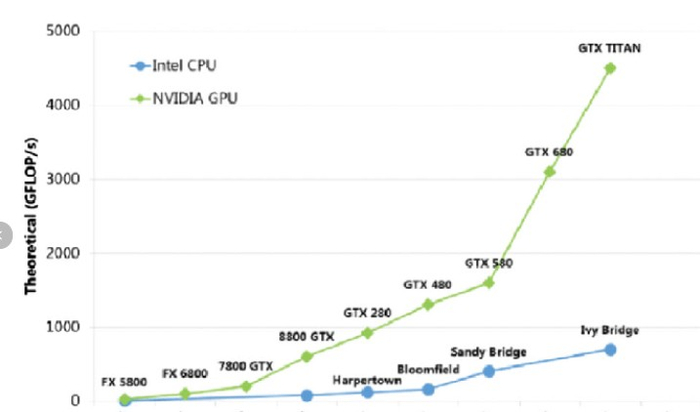 从理论层面来看,摩尔定律所预言的性能指数级增长趋势近几年来并没有消失,而是从CPU转到了基于大量核心的GPU。近年来GPU性能仍在遵循性能指数增长规律,大约2.2年性能就会翻倍。相比之下,英特尔CPU GFLOPs仍呈增长趋势,但是与GPU GFLOPs相比似乎成了一条直线。
