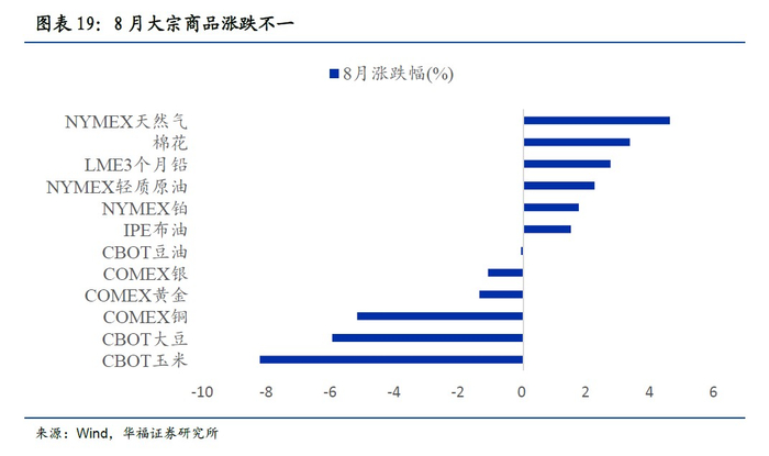 8月大宗商品涨跌不一。NYMEX天然气(4.58%)涨幅最大,棉花(3.33%),LME3个月铅(2.73%),NYMEX轻质原油(2.23%),NYMEX铂(1.73%),IPE布油(1.48%),涨幅居前。CBOT玉米(-8.25%)跌幅最大,CBOT大豆(-5.99%),COMEX铜(-5.21%),COMEX黄金(-1.38%)有所下跌。