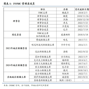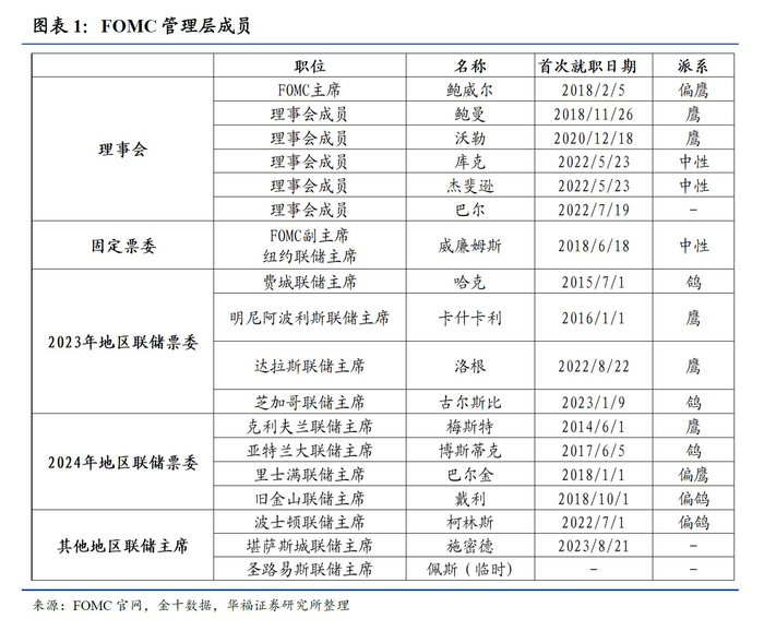 从本轮加息周期开始,美联储各官员在不同场合都发表了自己的观点,可以看出在美联储内部对未来利率走向存在几种不同的声音,一种是主张加息的鹰派,一种是主张保持利率稳定甚至降息的鸽派,以及对加息态度模棱两可的中间派。在本轮加息周期的后半程,这种分歧也越来越明显,7月的议息会议纪要显示虽然FOMC中11个有投票权的委员7月份一致同意加息,但这个决定没有获得18名委员的全体支持,有两人支持或“本来有可能”支持维持利率不变。我们从美联储的架构出发,对本轮加息周期中各个官员的公开发言进行梳理,总结了FOMC各个票委的派系。